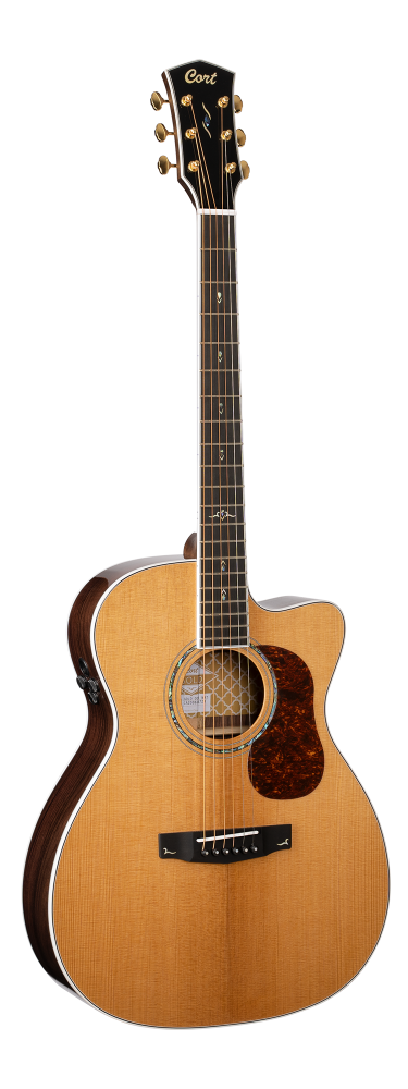 The new Gold-OC8 was developed in order to meet the demand for top-tier quality guitar from players who seek a comfortable OM sized body with 43mm (1 11/16”) nut width. The hallmark of Cort’s Gold series is the Aged to Vintage (ATV) treatment that allows the Master Grade solid Sitka spruce top to cure and open up more over time. ATV acts as a torrefaction process, giving the Gold-OC8 a big, open tone that’s bright yet natural with a strong and warm midrange that’s reinforced by the solid Pau Ferro back and sides. A sonically enhanced UV finish is added to protect both the instrument and enhance tonal quality and Fishman®’s innovative Flex Blend System offers a wide range of sonic control along with a built-in tuner.
